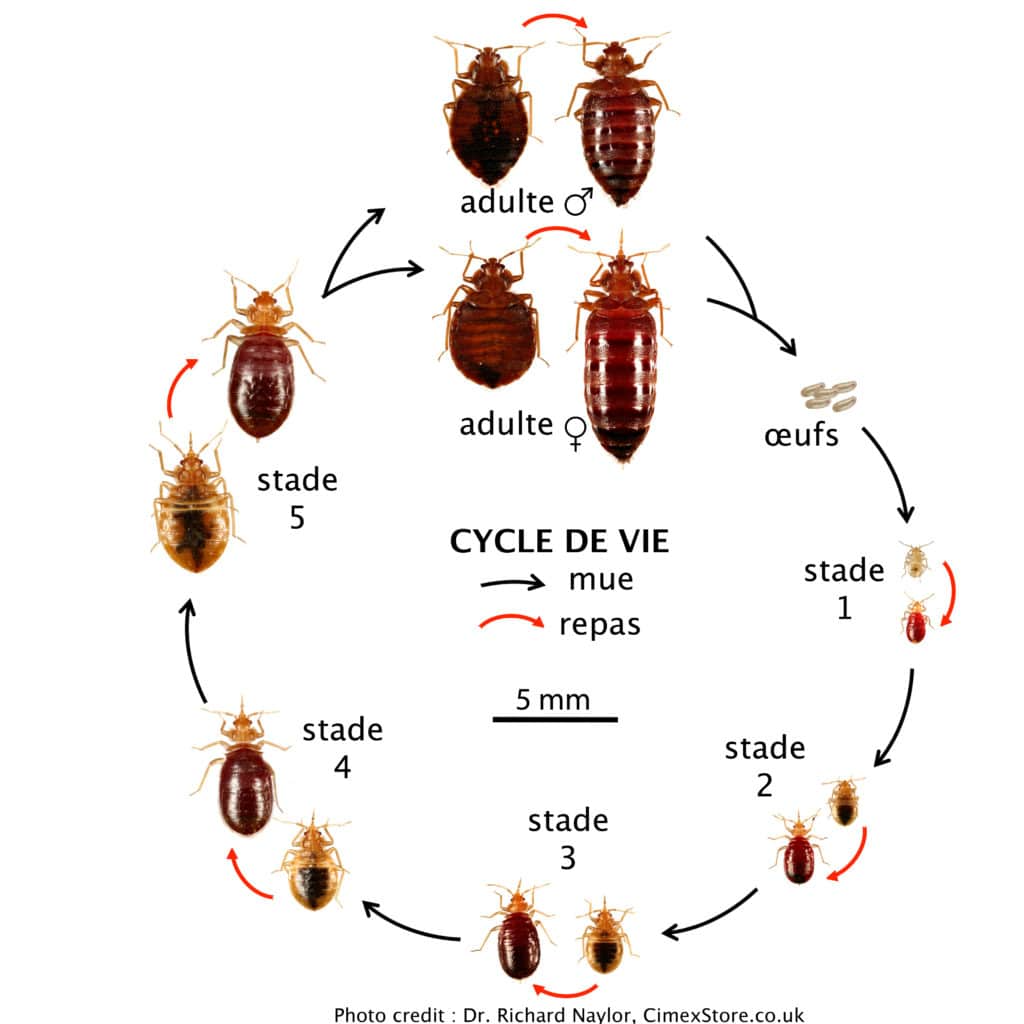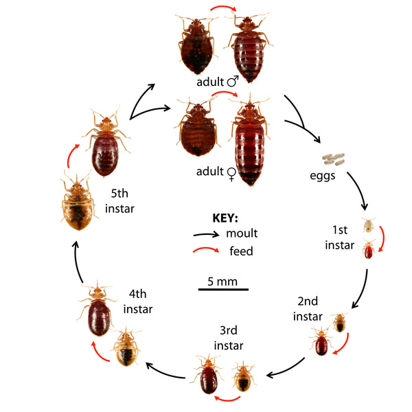 El ciclo de vida de las chinches incluye varias etapas: huevo, cinco etapas de ninfa y luego adulto. Los huevos, blancos y casi microscópicos, se ponen en pequeños grupos y eclosionan en aproximadamente una semana. Cada etapa de ninfa requiere una ingesta de sangre para evolucionar a la etapa adulta. Estos insectos pueden propagarse rápidamente de un lugar a otro a través de la ropa, el equipaje o incluso el mobiliario de segunda mano, favoreciendo así su propagación en hoteles, residencias y transporte público.