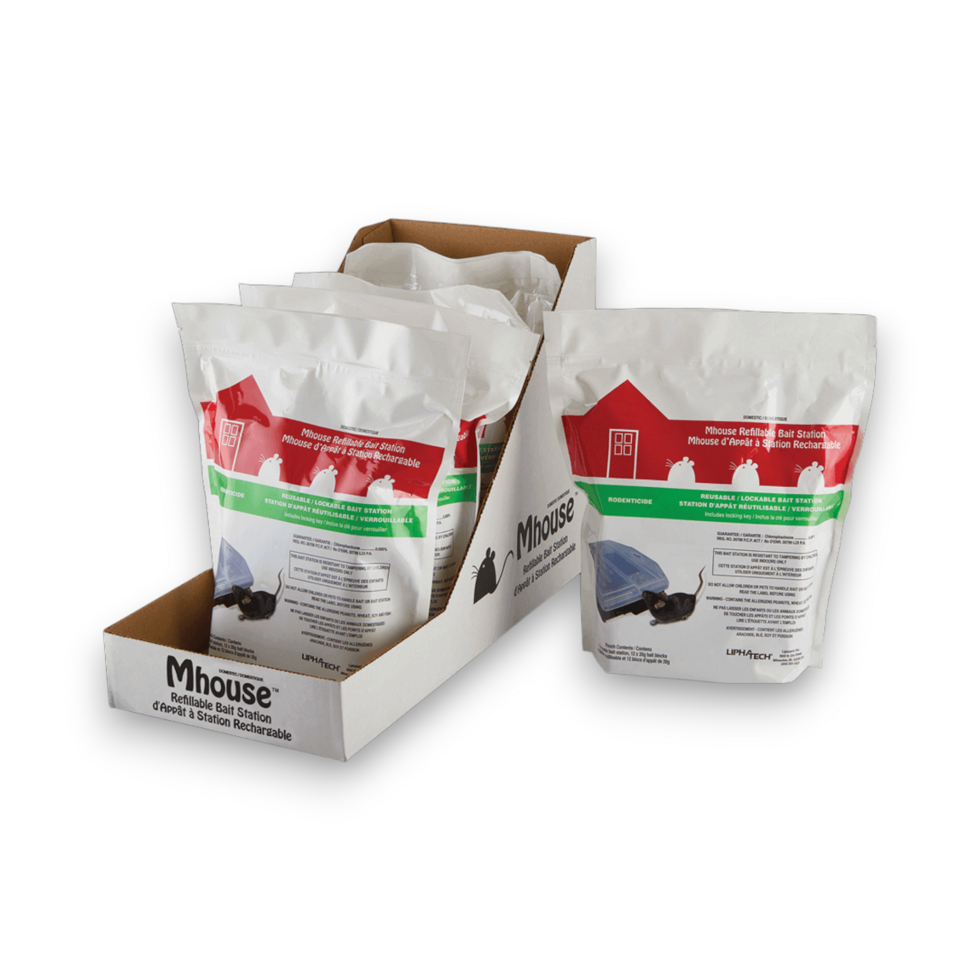 Les station d'appât rechargeable Mhouse™ est un rodenticide pour éliminer les souris de marque nationale. Chaque emballage contient une station pour souris à couvercle transparent verrouillable et réutilisable, ainsi que 60 blocs de chlorophacinone de 20 grammes.